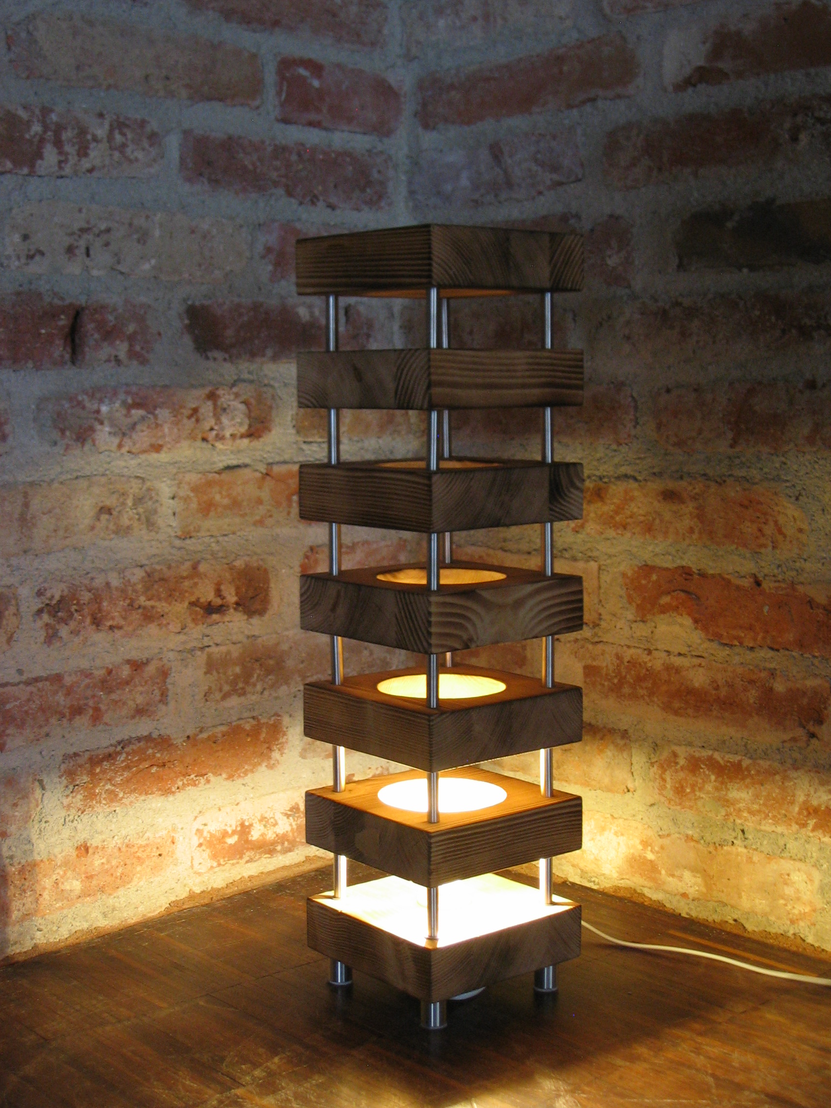 7 Holzquader (verleimtes Fichtenholz 20x20x7 cm, beflammt) zu einer Lichtsäule verschraubt. Hervorragend geeignet für eine indirekte Beleuchtung.