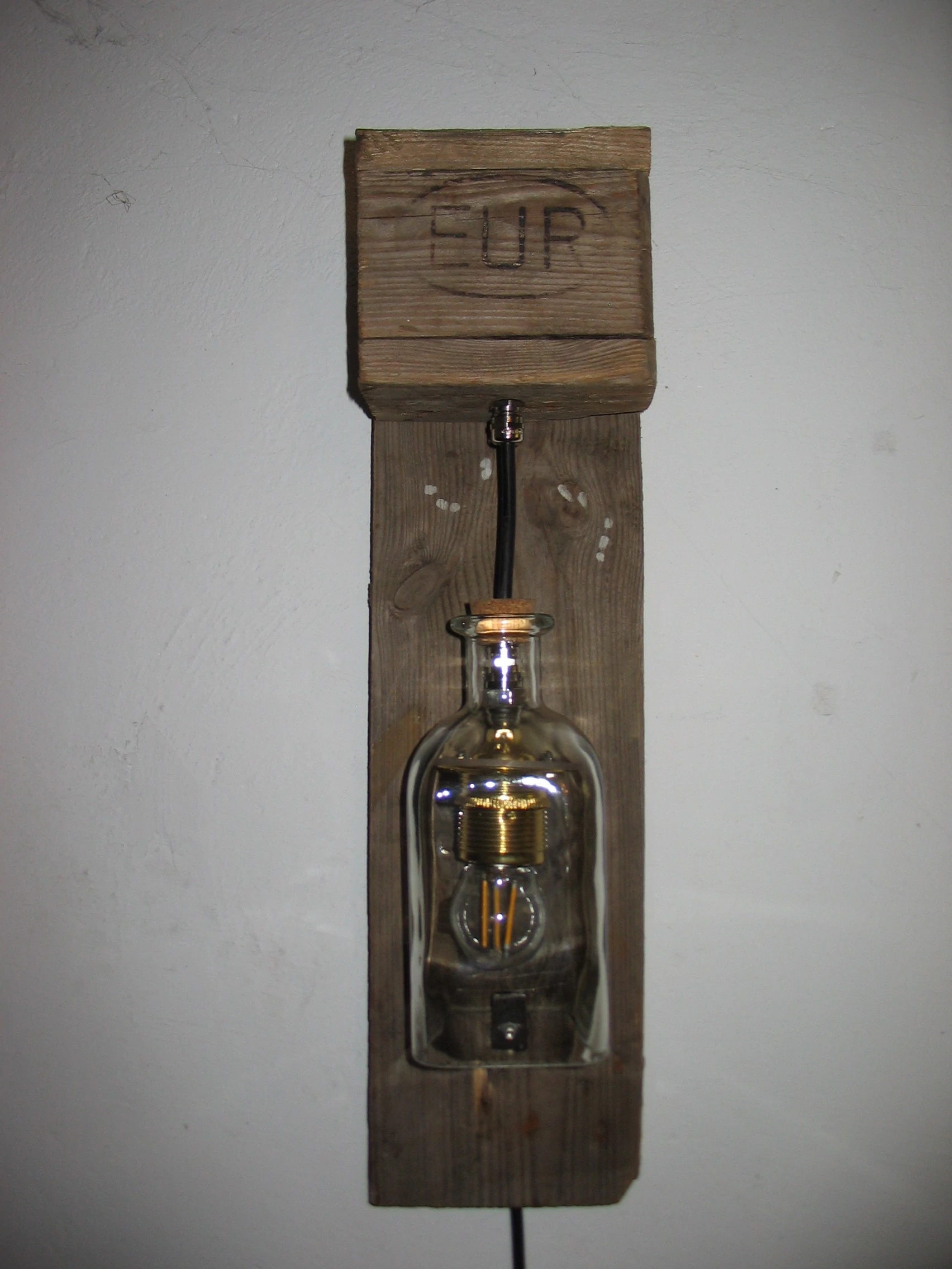 Wandleuchte gefertigt aus Teilen einer Europalette. Glasflasche ist eine alte Apothekerflasche. Leuchtmittel: LED-Lampe E 27, EEK: A++, 2,5 W, 250 lm, 2700K ==> entspricht einer 25 Watt-Glühbirne